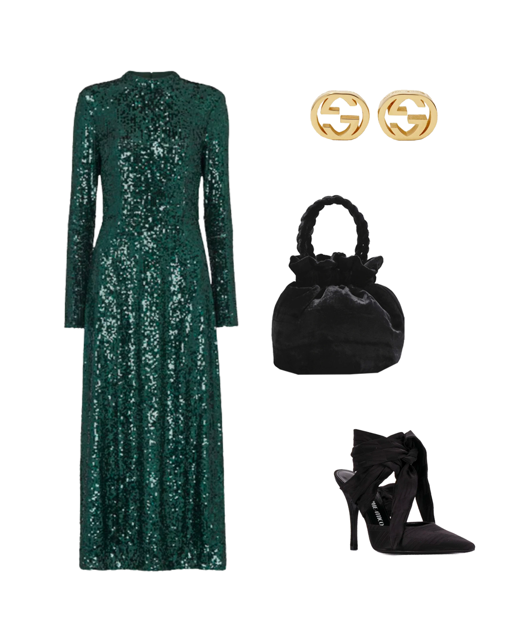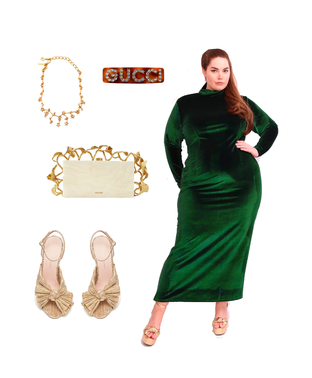 If anyone knows how to nail event dressing, it’s celebs. We’re channelling Ashley Graham at our next get together — she knows velvet and party wear go hand in hand. Winter is when some of fashion’s most sumptuous fabrics come into their own, and plush velvet is an easy way to evoke glamour. On the runway, Dior, Area and Burberry all showcased elegant velvet eveningwear. Echo the designer looks in this jewel tone dress — the sartorial equivalent of the party spirit. When it comes to accessories, we say go for gold — Loeffler Randall’s are always a good idea. And thanks to Gucci’s must-have slide, your hairstyle too, can shine under the disco lights.