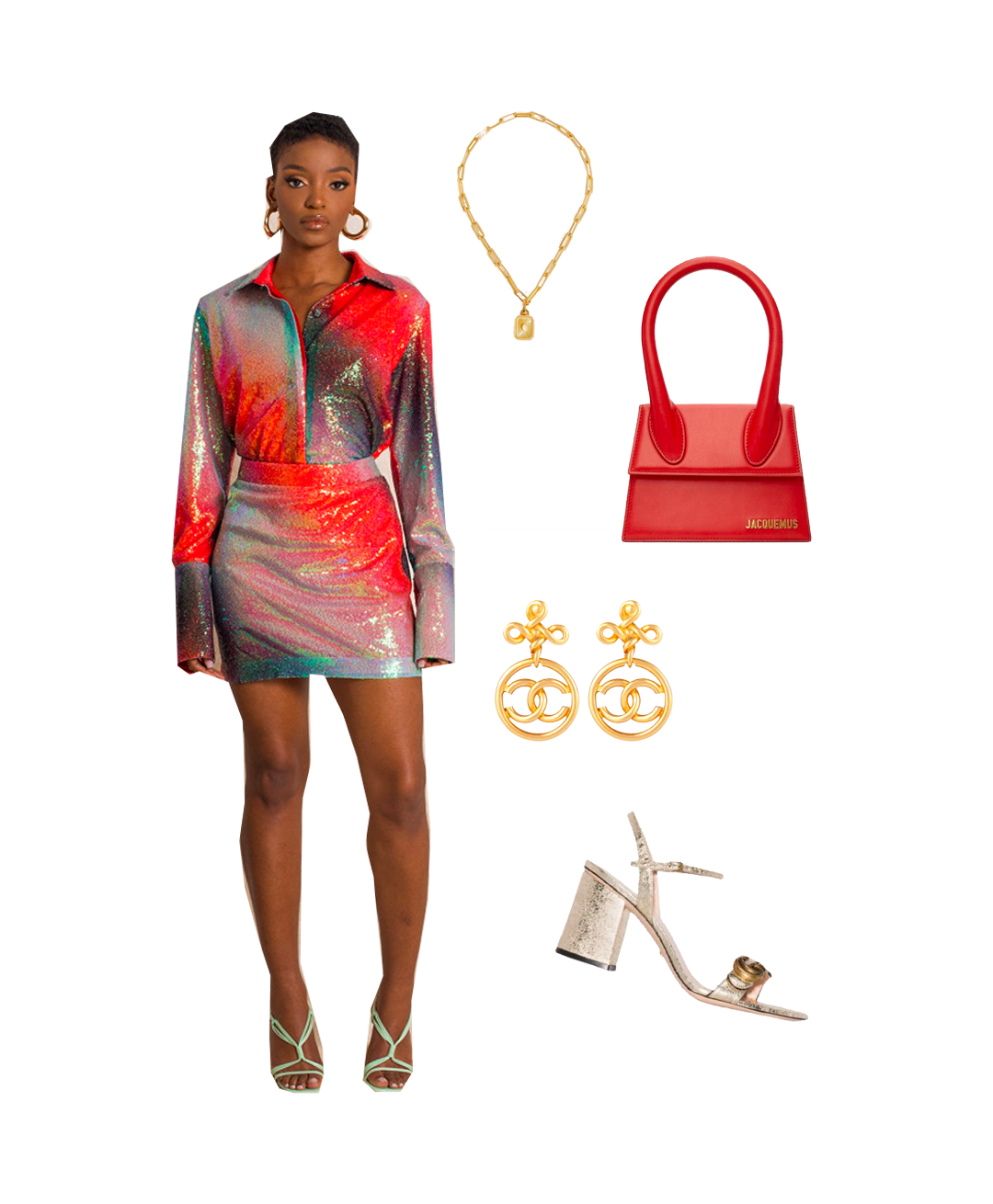 If dresses just aren’t your thing, don’t fear — an abundance of dancefloor-ready tops, skirts and trousers ensure you will still feel dressed to kill this winter. Make like models Shay Zanco and Nahuane Drumond in show stopping separates — Kai’s Cherry Glaze Set is our must-have pick. The walking equivalent to the Kira Kira glitter filter, the combination of sparkles and zingy shades is so pretty. PSA: Know that this Jacquemus bag will never stop trending — you’ll be the envy of party goers everywhere as it accompanies you for the evening. Add little vintage Chanel jewellery for extra flair, and heels — always.