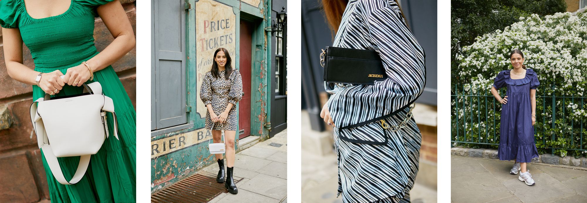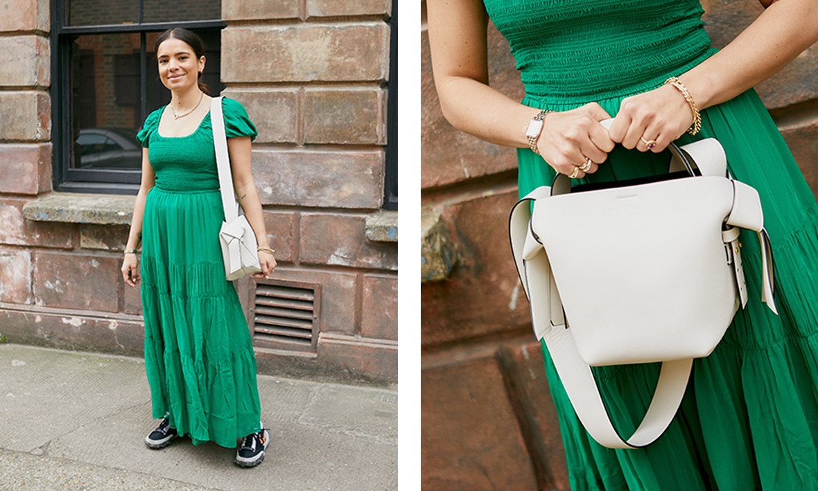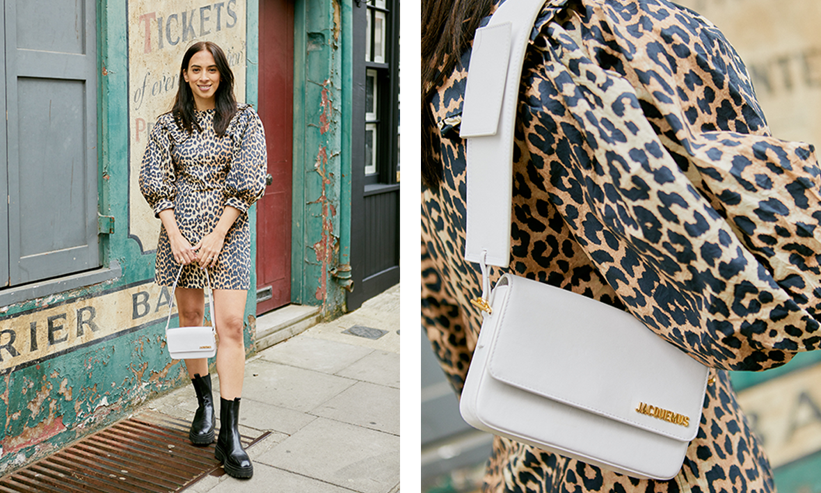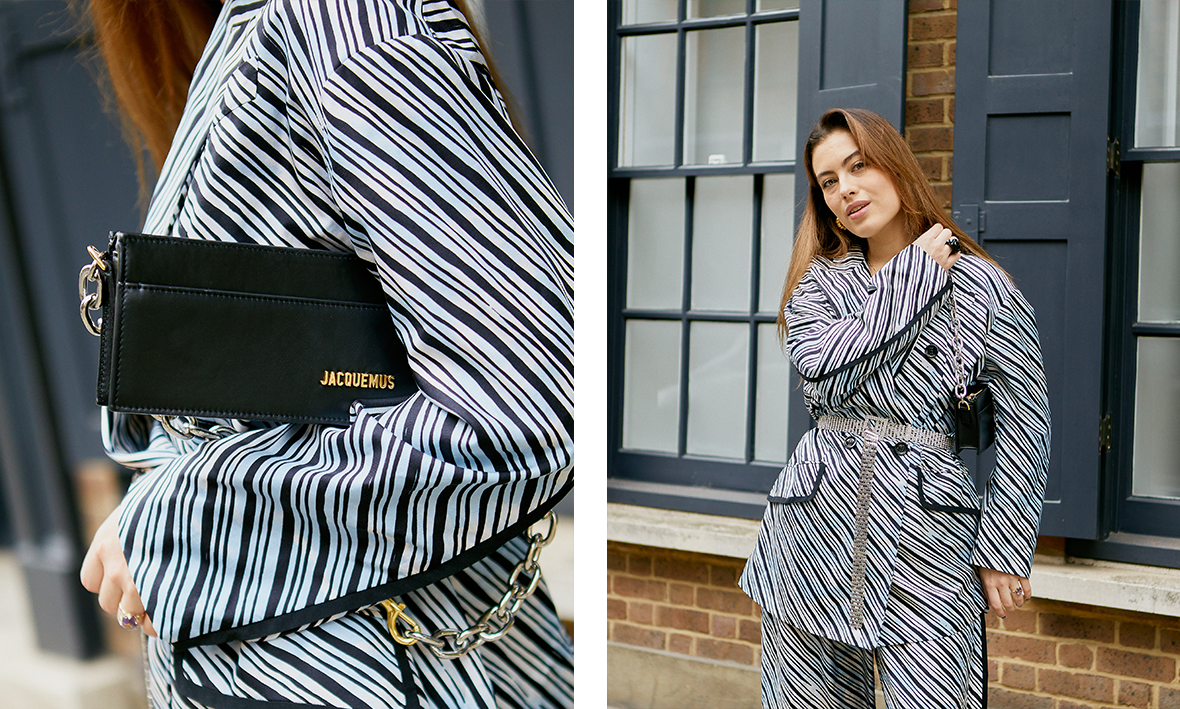 "I love this striped co-ord for either weekend brunch or even a night out. I've brought in a cool 00s element with the diamanté belt and - of course - our exclusive Jacquemus bag."